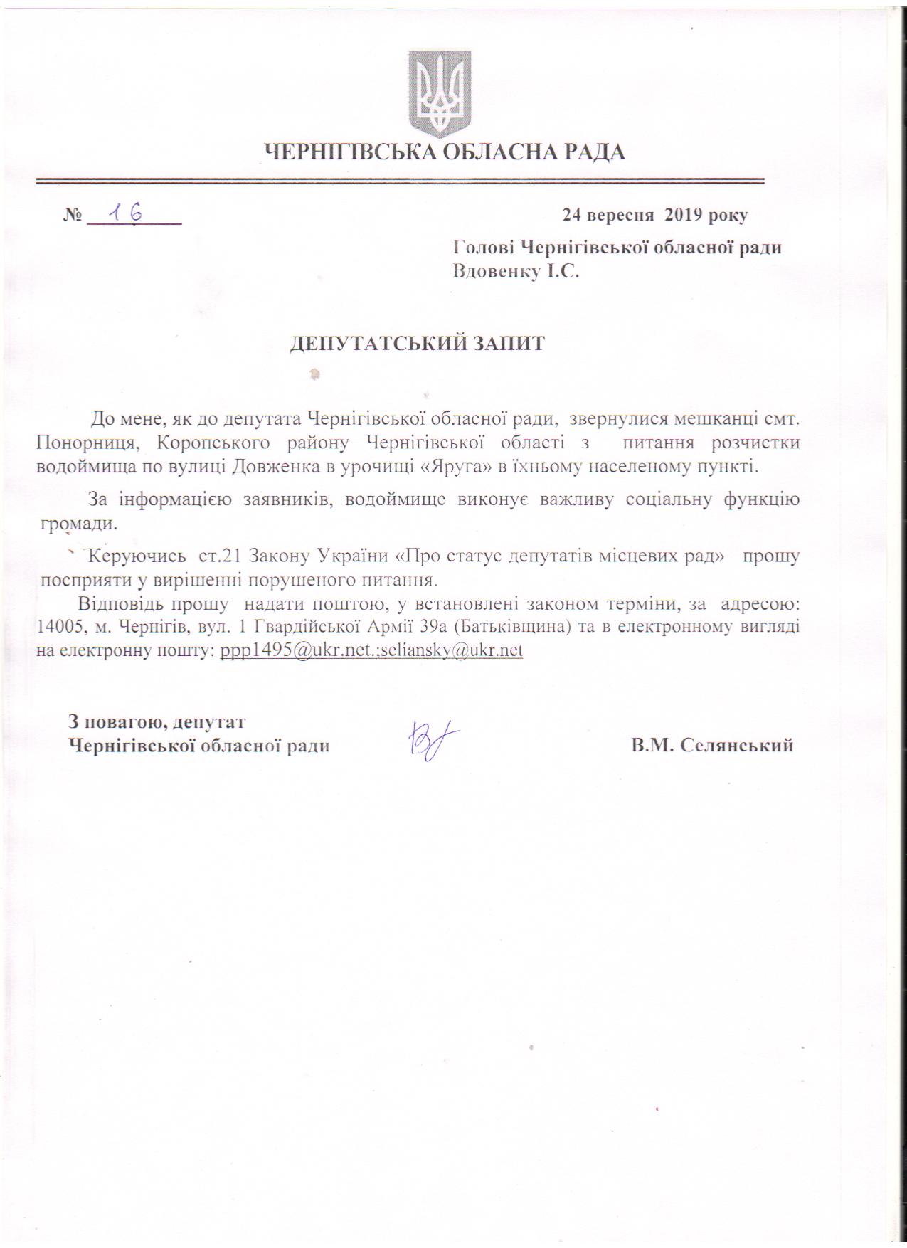 Заслухавши запит депутата Селянського В.М. щодо виконання робіт з розчистки водоймища, що знаходиться по вулиці Довженка в урочищі «Яруга» в смт Понорниця Коропського району, відповідно до статтей 21 та 22 Закону України «Про статус депутатів місцевих рад», керуючись пунктом 9 частини 1 статті 43 Закону України «Про місцеве самоврядування в Україні», обласна рада вирішила: