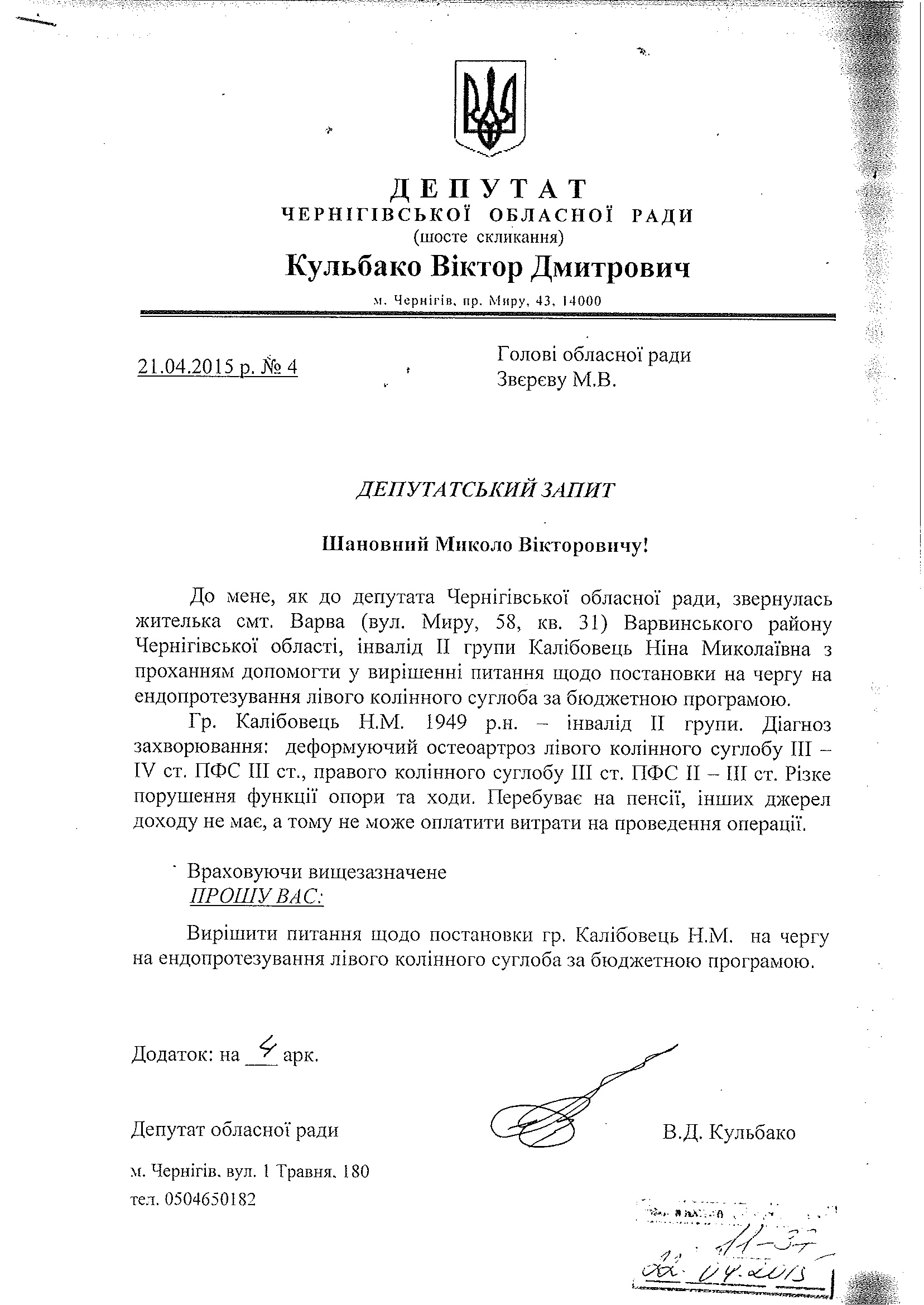 Заслухавши запит депутата Кульбаки В.Д. щодо вирішення питання постановки громадянки Калібовець Н.М., інваліда ІІ групи, в чергу на ендопротезування колінного суглобу за бюджетною програмою, відповідно до статті 22 Закону України «Про статус депутатів місцевих рад», керуючись пунктом 9 частини 1 статті 43 Закону України «Про місцеве самоврядування в Україні», обласна рада вирішила: